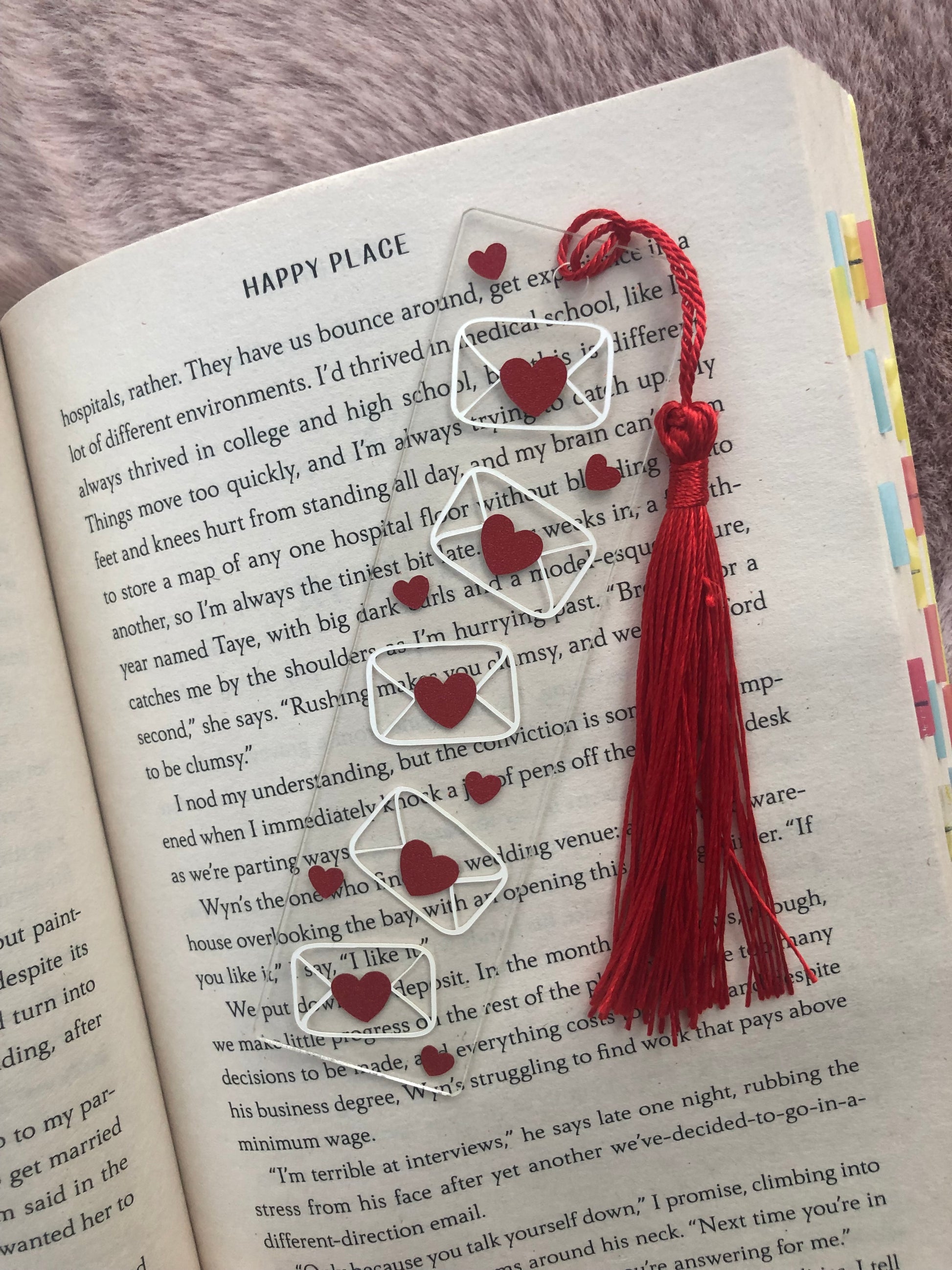 Bladwijzer met witte enveloppe en glitter rode hartjes.