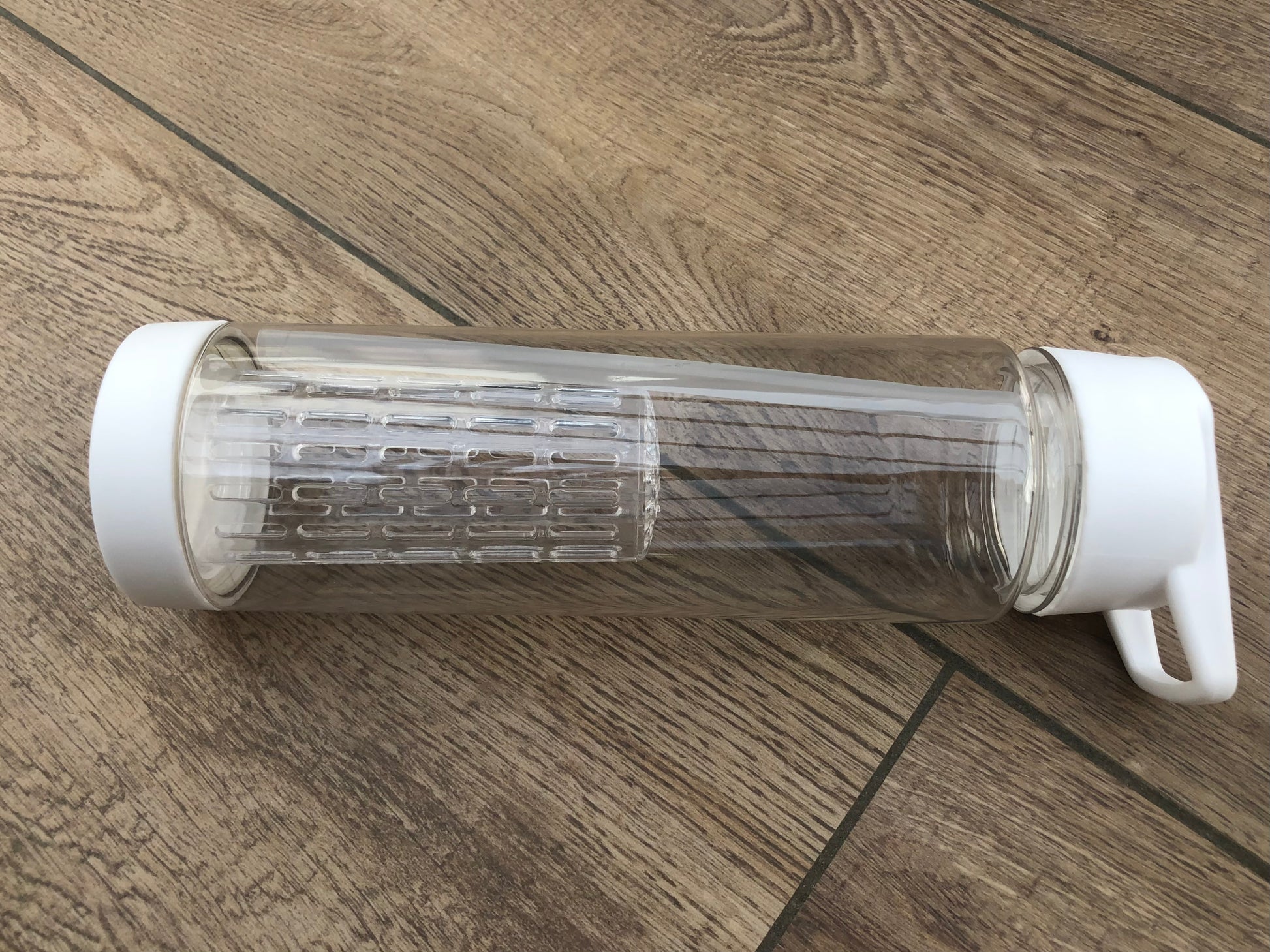 -witte schroefdop, transparante fles, witte schroefonderkant, uitneembare fruitinfuser, opklapbare drinktuit met rietje
