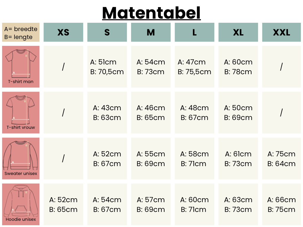 -Opgelet! Aangezien deze sweaters unisex zijn, kan het zijn dat je als vrouw een maatje kleiner nodig hebt. Bekijk zeker de matentabel voor de juiste maat.